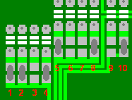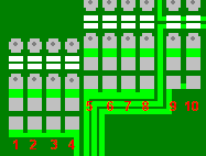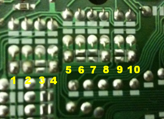 The ten pads are made up of an upper and a lower section, and will look roughly like this shown below. Some will have a blob of solder linking the upper and lower pads, and its these blobs and their locations that we need to identify as a pad code.