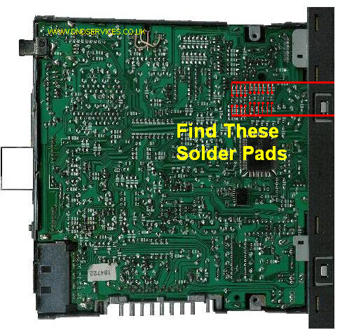 Now carefully prize off the lower cover, taking care not to distort its shape and this will reveal the main circuit board as shown below. For orientation, the fascia should be pointing towards the right hand side, and you are now looking to identify a set of ten solder pads as shown on the picture. These are not all exactly in a straight line, but once you have identified them, you will understand what we mean by this.