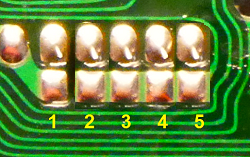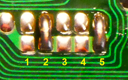 The five pads are made up of an upper and a lower section, and will look roughly like this shown below. Some will have a blob of solder linking the upper and lower pads, and its these blobs and their locations that we need to identify as a pad code.