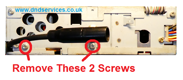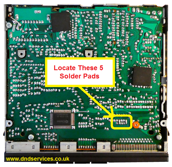 Start by removing the 4 Phillips screws on the base: And the 2 Phillips screws on the rear: The two side mounting brackets will also need to be removed. If you turn the unit over and remove the 2 screws on the top, (one each side) this will then release the metalwork: Now carefully prize off the bottom cover, taking care not to distort its shape and this will reveal the main circuit board as shown below. For orientation, the fascia should be pointing towards you, and you are now looking to identify a set of five solder pads as shown on the picture. These are all in a straight line, and once you have identified them, the next bit is very straightforward.