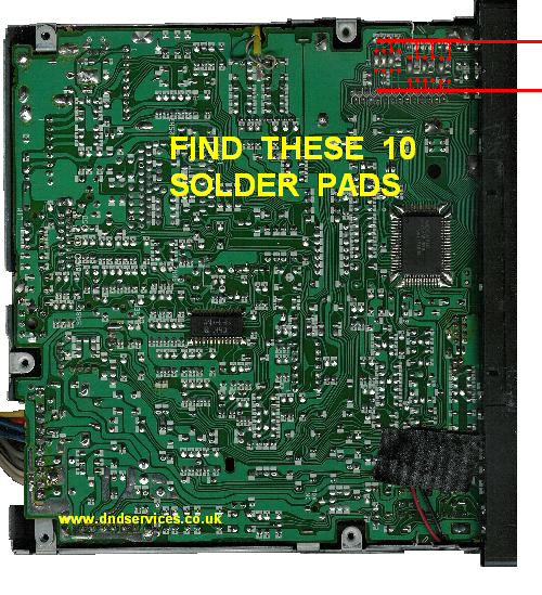 Start by removing the 5 Phillips screws on the top: Now carefully prise off the top cover, taking care not to distort its shape and this will reveal the main circuit board as shown below. For orientation, the fascia should be pointing towards the right hand side, and you are now looking to identify a set of ten solder pads as shown on the picture. These are not all exactly in a straight line, but once you have identified them, you will understand what we mean by this.