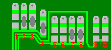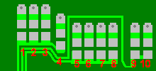 The ten pads are made up of an upper and a lower section, and will look roughly like this shown below. Some will have a blob of solder linking the upper and lower pads, and its these blobs and their locations that we need to identify as a pad code.