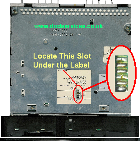 Start by turning the radio upside down, with the fascia towards you, and you will see the large white Manufacturers label on the bottom. Run your fingers across this label and you should feel a small rectangular slot which we need to open up by gently removing the part of the label that covers this. You should now see the green circuit board inside.